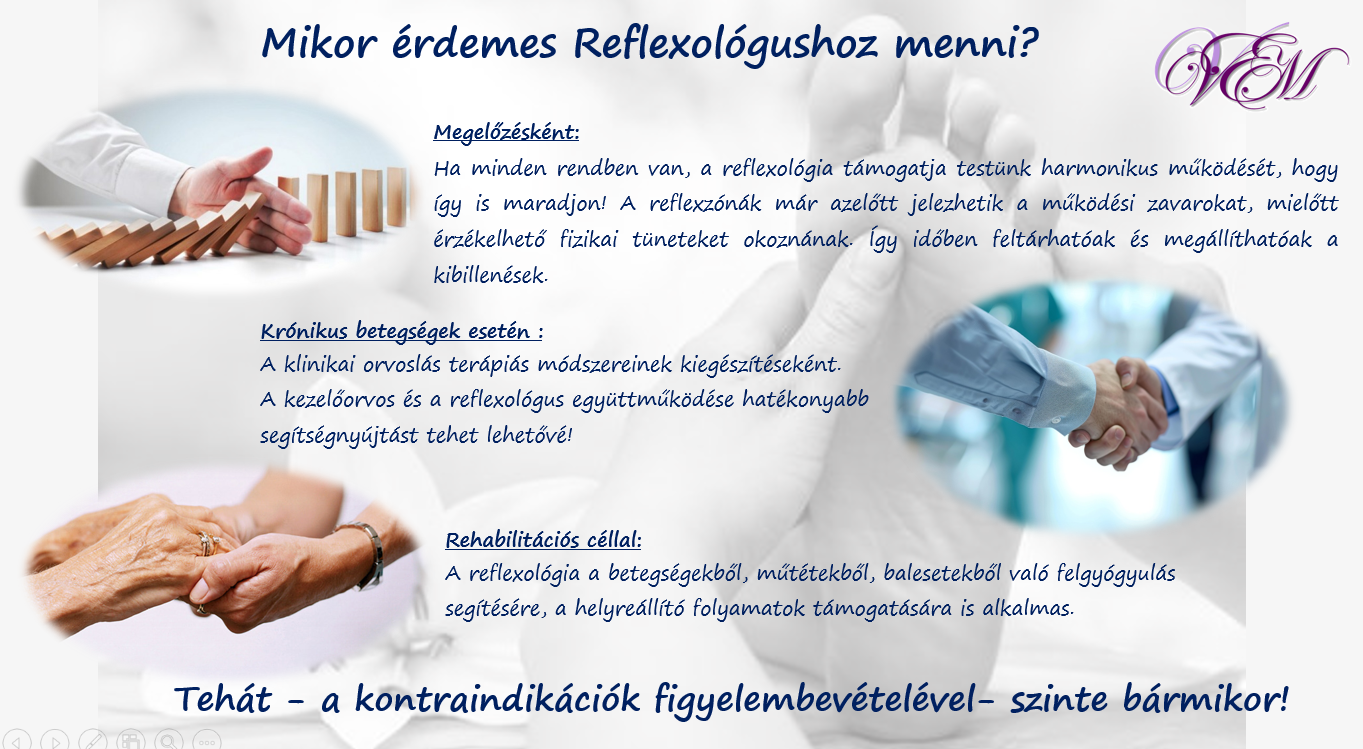 - Prevencióra: Ha minden rendben van, a reflexológia támogatja a testünk harmonikus működését, hogy így is maradjon! A reflexzónák már azelőtt jelezhetik a működési zavarokat, mielőtt érzékelhető fizikai tüneteket okoznának. Így időben feltárhatóak és megállíthatóak a kibillenések!