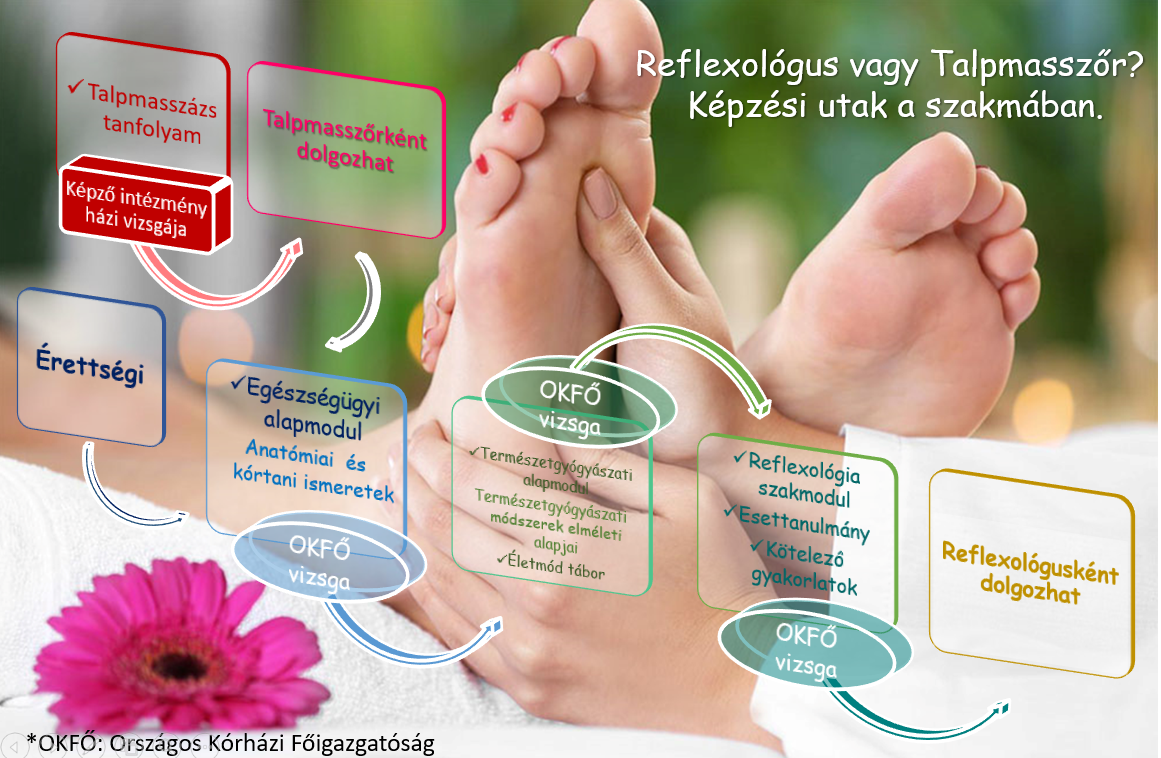 A lenti ábrán nyomon követhetjük a képzési utakat, melyek akár össze is kapcsolódhatnak, amennyiben egy talpmasszőr tovább szeretné képezni magát reflexológussá. (A reflexológus képzésnek nem előfeltétele a talpmasszázs ismerete, a tananyagban az elmélet mellett a masszázsfogások is szerepelnek.)